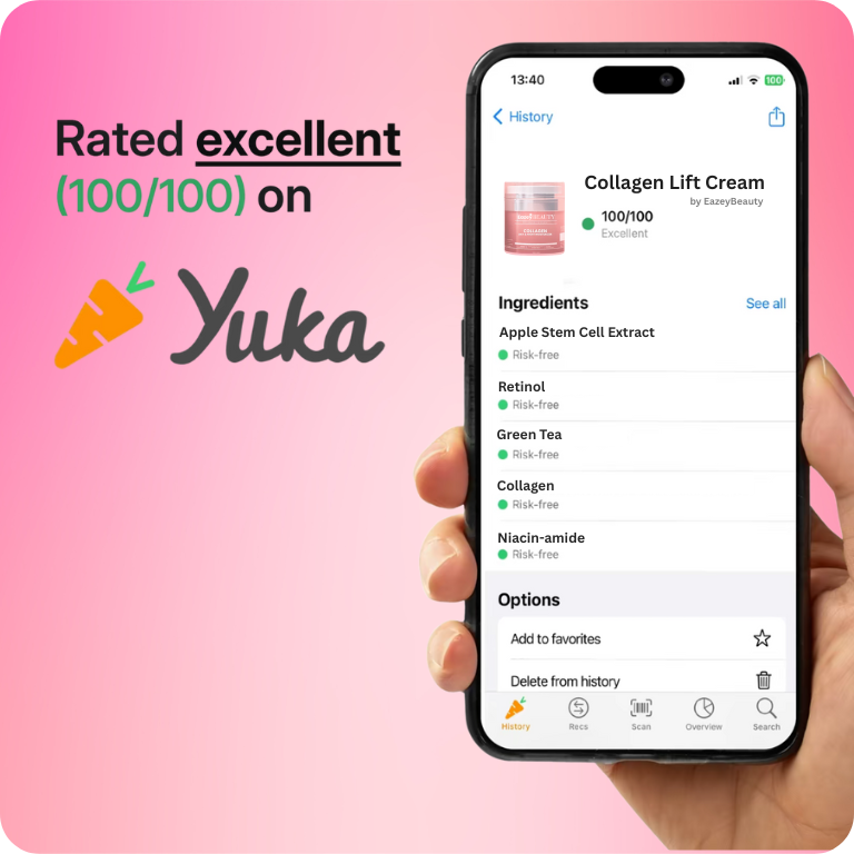 Eazey Beauty’s Collagen Lift Cream proudly scored a 100/100 “Excellent” rating on Yuka, the independent app that reviews product safety and ingredient quality. 🌿✨